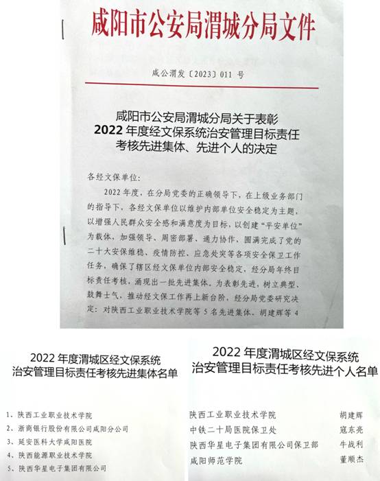 近日,我校先后被咸阳市公安局和咸阳市公安局渭城分局分别评为 “2022年度全市单位内部保卫工作成绩突出集体”和“2022年度经文保系统治安管理目标责任考核先进集体”称号;同时,保卫处处长胡建辉同志被咸阳市公安局渭城分局授予“2022年度渭城区经文保系统治安管理目标责任考核先进个人”称号。