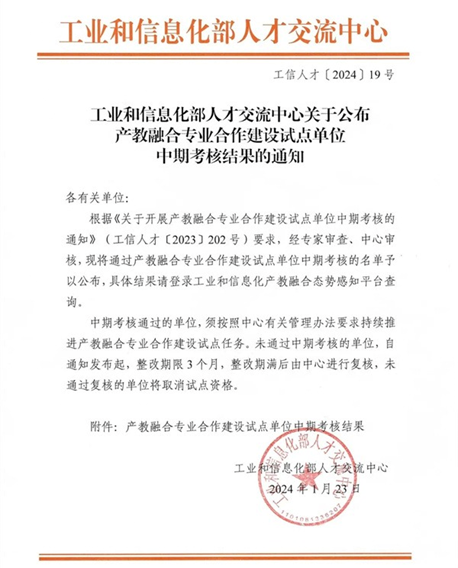 近日,工业和信息化部发布了《工业和信息化部人才交流中心关于公布产教融合专业合作建设试点单位中期考核结果的通知》,我校机械制造及自动化专业顺利通过了中期考核。