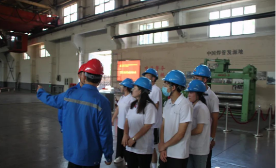 实地参观。参观完了办公大楼,实践团的成员们跟随薛康利师傅的脚步,来到了车间。进入车间首先看到了“中国焊管从这里走来,从这里燎原……”成员们看到了中国第一根螺旋埋弧焊钢管。薛师傅介绍,1959年9月26日,第一根螺旋埋弧焊钢管成功下线,这根钢管光荣参与了建国十周年献礼。从此,苦干、实干加巧干的“干”字文化,成为宝鸡钢管最具特色的红色基因。正是凭着“干”字当头的坚韧与执着,宝鸡钢管持续传承、不断丰富“一个人、一条路、一根管、一片天”的精神内涵,赓续红色血脉,与共和国共同成长,一路前行。