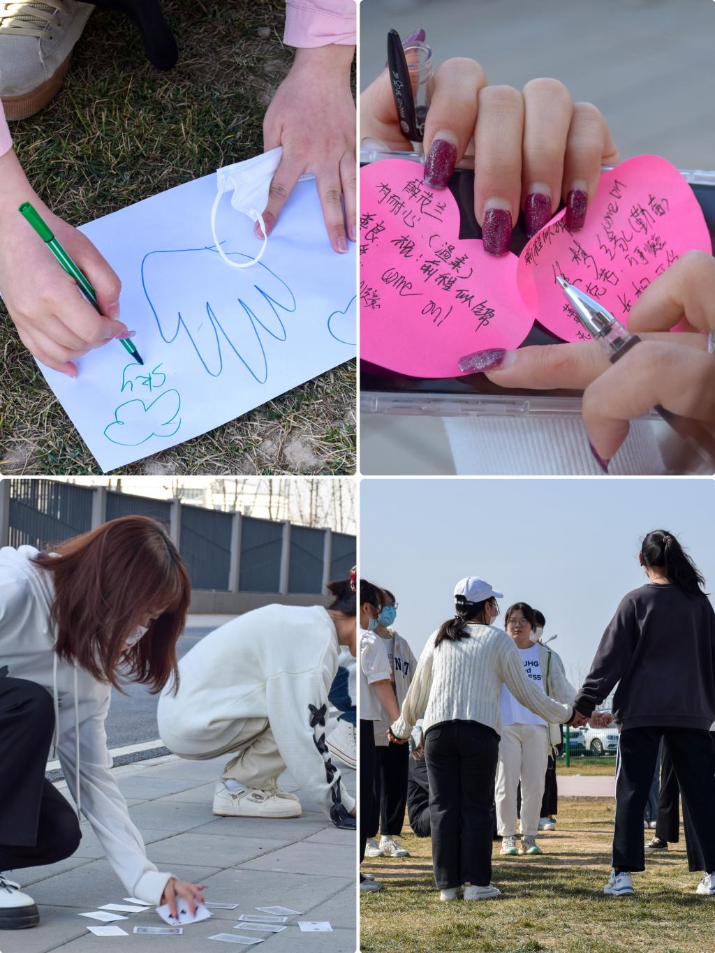 本次活动共有六个环节。活动开始前,指导老师详细介绍了活动规则。热身活动“爱在指尖”迅速拉进了彼此的心理距离,活跃了气氛。在“心有千千结”环节,同学们通过跨、钻、套、转等各种配合,解开了错综复杂的“手链”。“花团”飞驰,手臂交错,“击鼓传花”让同学们展示了风采、释放了情绪。“心电绘图”、“达芬奇密码”考验的是精诚配合、密切沟通的能力,大家八仙过海、各显神通,在活动中感受团队合作的魅力。在“放飞祝福”环节,同学们纷纷在彩纸上写下自己的祝福,飞机滑翔,祝福远航,爱和希望在彼此间传递。
