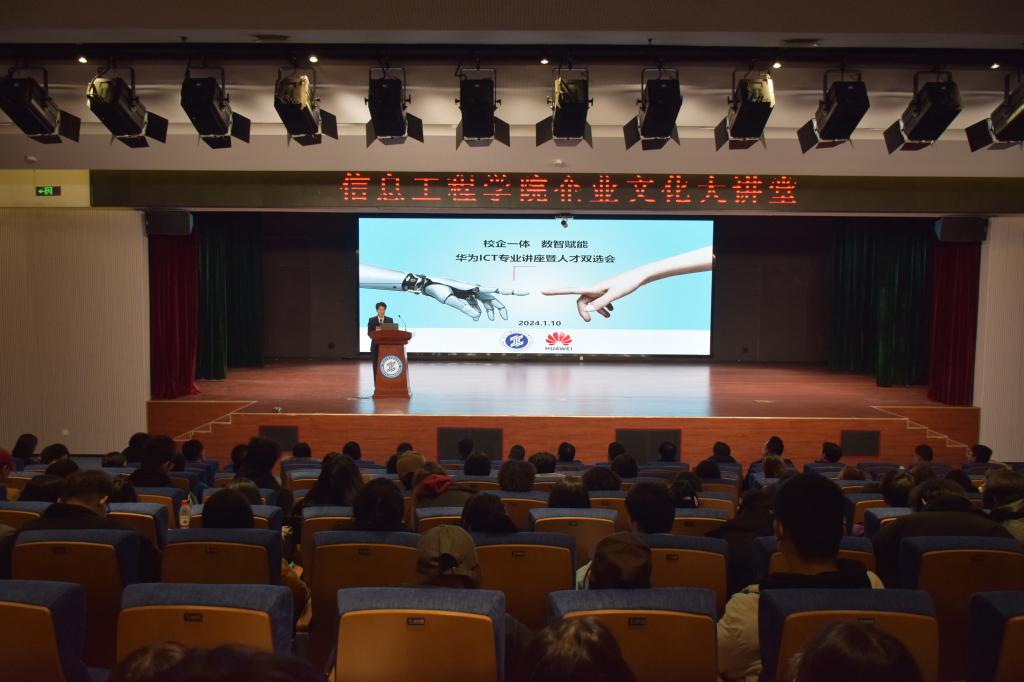 为精准做好学生就业指导工作,帮助学生明确就业方向,提升就业竞争能力,实现高质量就业,1月10日下午,信息工程学院在经开校区图文报告中心举办了华为ICT专业讲座暨人才双选座谈会。学院特邀华为技术有限公司(简称:华为)、ICT人才生态(陕西)联盟以及16名华为生态企业代表联合开展ICT专业讲座。信息工程学院院长白国政、辅导员以及2021、2022级300余名学生代表共同出席活动。