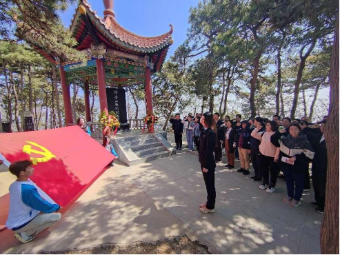 沿着陡峭的台阶拾级而上,同志们在山顶集体瞻仰爷台山战斗纪念碑,敬献花篮,肃立默哀,合唱红色歌曲,深切缅怀革命先烈,追忆革命先烈们前赴后继、抛头颅洒热血的光辉事迹,感受先辈们不惧艰难投身革命的坚定信念。在爷台山战斗纪念碑前,面向鲜红的党旗,在党员惠舒靖同志的带领下,全体党员面向党旗举起右拳,庄严宣誓,重温了入党誓词。
