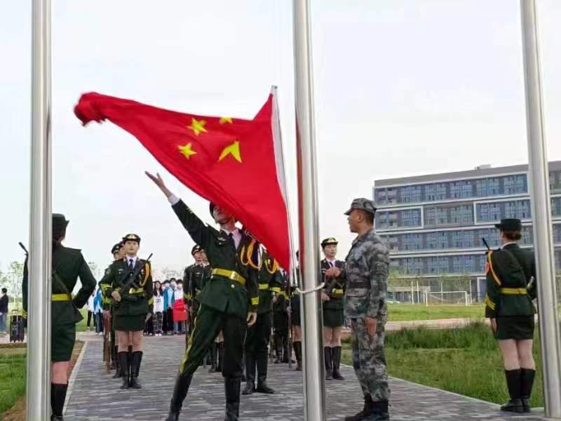 6点50分,升旗仪式正式开始。迎着初升的朝阳,国旗护卫队队员护送鲜艳的五星红旗走向升旗台,伴随着庄严的国歌声,全体师生昂首肃立,向国旗行注目礼。