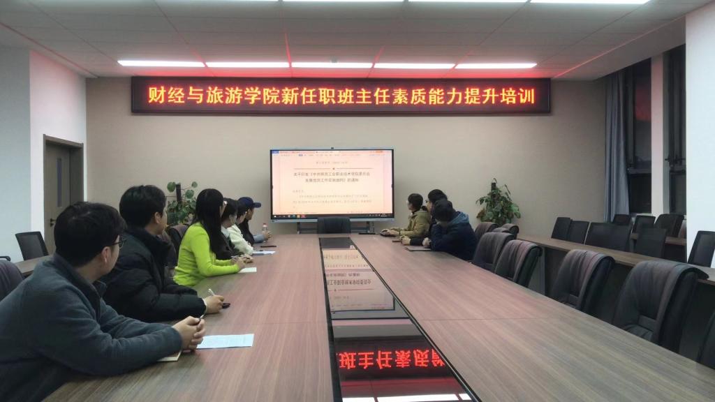 为进一步加强班主任队伍建设,切实提高我院班主任的自我修养和履职能力,精心打造一支治班方略科学,管理方法先进的高素质班主任队伍。12月10日晚,财经与旅游学院开展新任职班主任素质能力提升培训工作,参加培训的有学工办主任杜娟、专职团干部王甲鸣、学生第一党支部书记马文燕以及新任职班主任和任期未满一届的班主任。