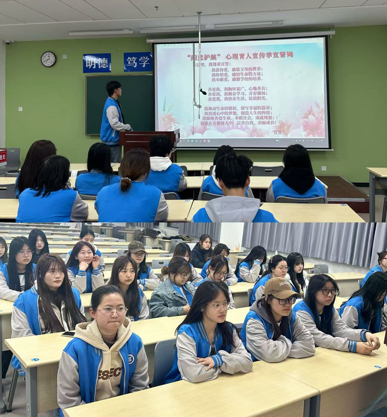 主题班会上,学生们集体观看了第九届“阳光护航”心理育人宣传季实践活动总结视频以及第十届“阳光护航”心理育人宣传季实践活动动员视频。观看视频结束后,各班在心理委员的带领下进行庄严宣誓。全体学生在《善爱我》宣誓环节中庄严承诺,表达了关爱自我、善待他人的坚定信念,将现场氛围推向高潮。誓言声声,传递着对心理健康的重视与守护,也为这场活动奠定了温暖而坚定的基调。班会结束后,各位同学在线上完成了大学生心理健康科普知识竞赛预选赛。