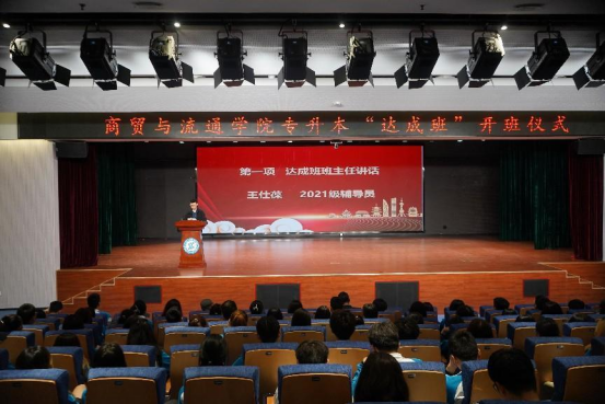 5月11日下午,商贸与流通学院在图文信息中心图文报告厅二举行2021级专升本“达成班”开班仪式,学工办主任成志平、辅导员代表、学生工作助理以及2021级专升本学生代表参加了开班仪式。