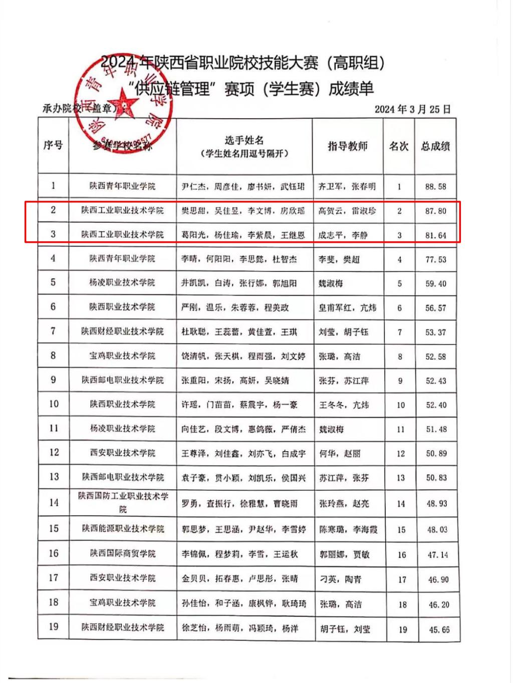 3月25日,2024年陕西省职业院校技能大赛高职组供应链管理赛项在陕西青年职业学院落下帷幕。我校商贸与流通学院现代物流管理专业2022级学生李文博,樊思甜,吴佳煜,房欣瑶组成的参赛队伍(指导老师:高贺云、雷淑珍)获第二名,杨佳瑜,葛阳光,王继恩,李紫晨组成的参赛队伍(指导老师:成志平、李静)获第三名的优异成绩,充分展现了学院在供应链管理领域的卓越实力和教育成果。