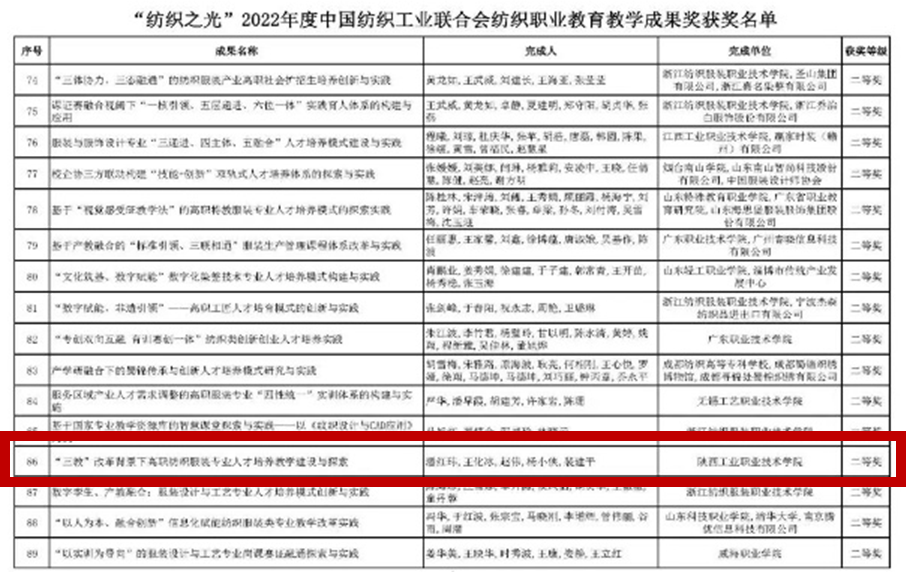 根据国务院发布实施的《教学成果奖励条例》和《中国纺织工业联合会纺织职业教育教学成果奖励办法》,经中国纺织工业联合会纺织教育教学成果奖励评审委员会审定,经中国纺联批准, “纺织之光”2022年度中国纺织工业联合会纺织教育教学成果奖授奖项目共计206项, 获得特等奖的奖励金由纺织之光科技教育基金会资助。本教育教学成果奖的设立旨在鼓励纺织服装院校积极深化教学改革,彰显“做中学、学中做”的纺织教育教学改革特点, 开拓创新, 提高纺织教育教学水平和教育质量,全面促进和推动纺织行业发展。