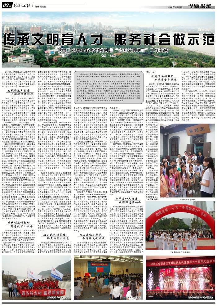 7月2日,由中国文明办指导的全国唯一的《精神文明报》在第2版以《传承文明育人才 服务社会做示范》为题目,从“全校师生齐创建,文明建设结硕果”、“党旗领航树标杆,思想教育上水平”、“理论武装强基础,群众活动...
